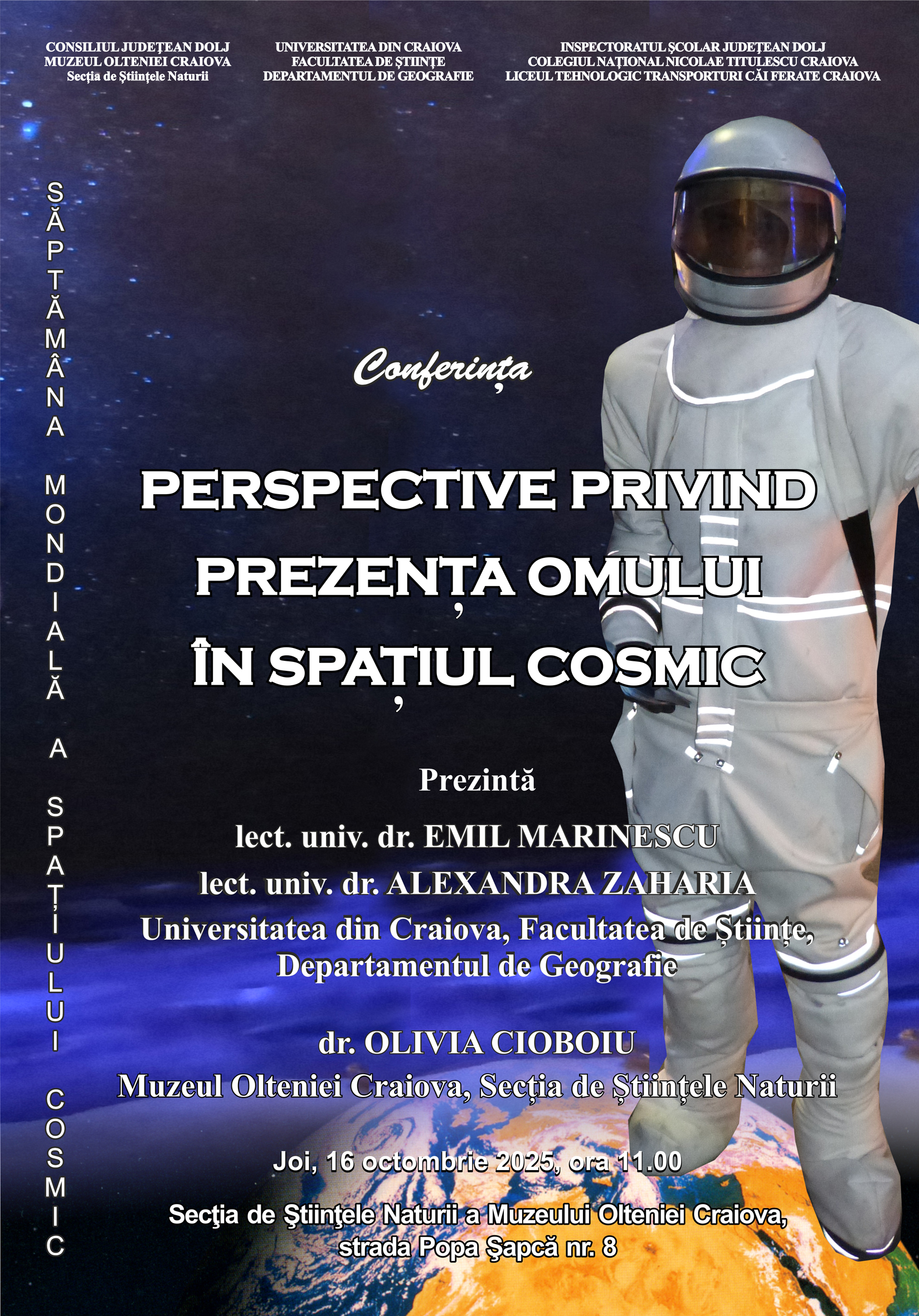 Secţia de Ştiinţele Naturii a Muzeului Olteniei Craiova continuă seria manifestărilor înscrise în cadrul proiectului cultural-educativ Mediul și Universul, cu prezentarea conferinței PERSPECTIVE PRIVIND PREZENȚA OMULUI ÎN SPAȚIUL COSMIC, o serie de videoproiecții susținute de lector univ. dr. Emil Marinescu, lector univ. dr. Alexandra Zaharia de la Departamentul de Geografie din cadrul Facultăţii de Ştiinţe a Universităţii din Craiova și dr. Olivia Cioboiu de la Secția de Științele Naturii a Muzeului Olteniei Craiova.
